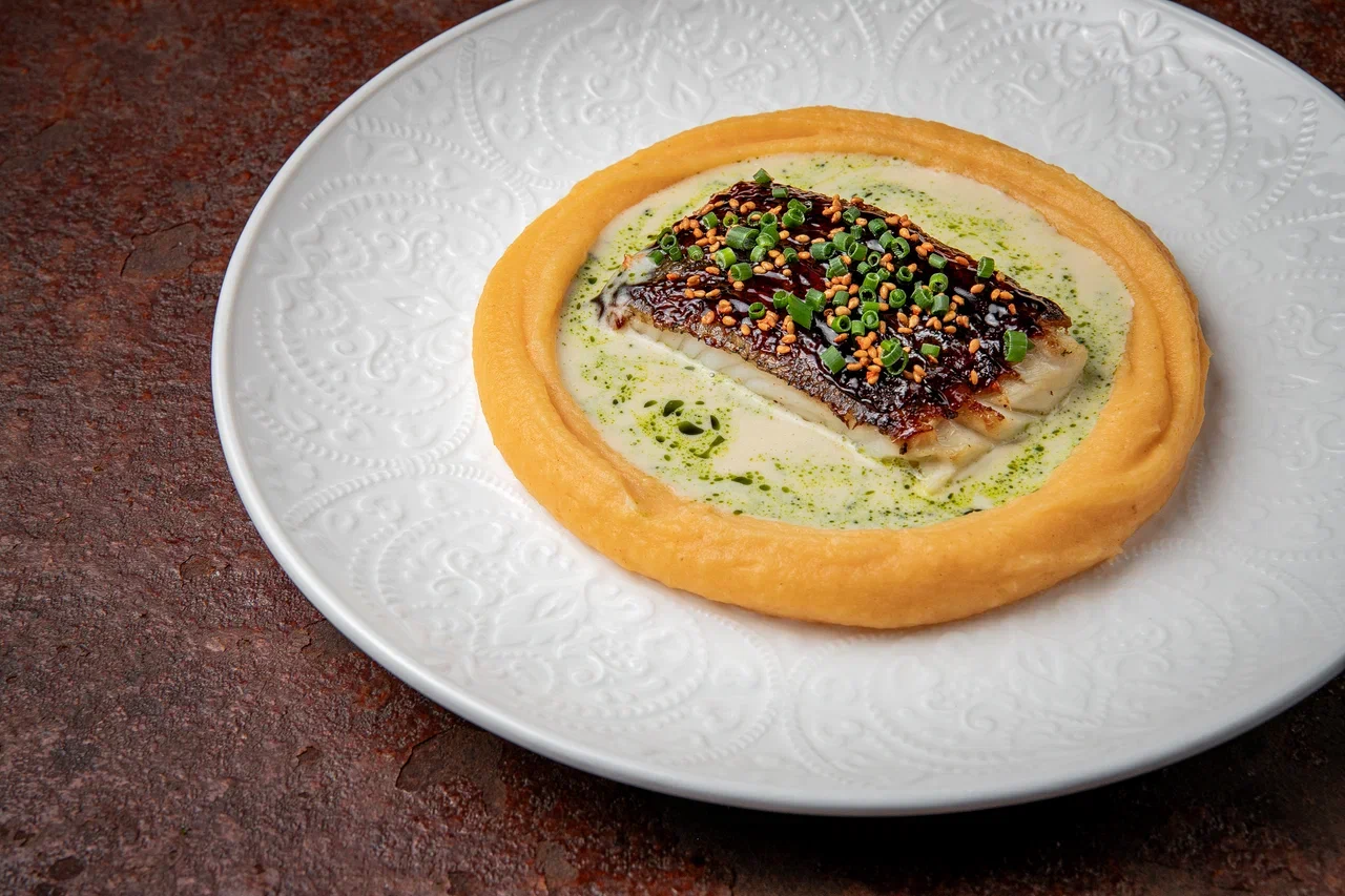 Палтус с пюре из кимчи и пряным бербланом